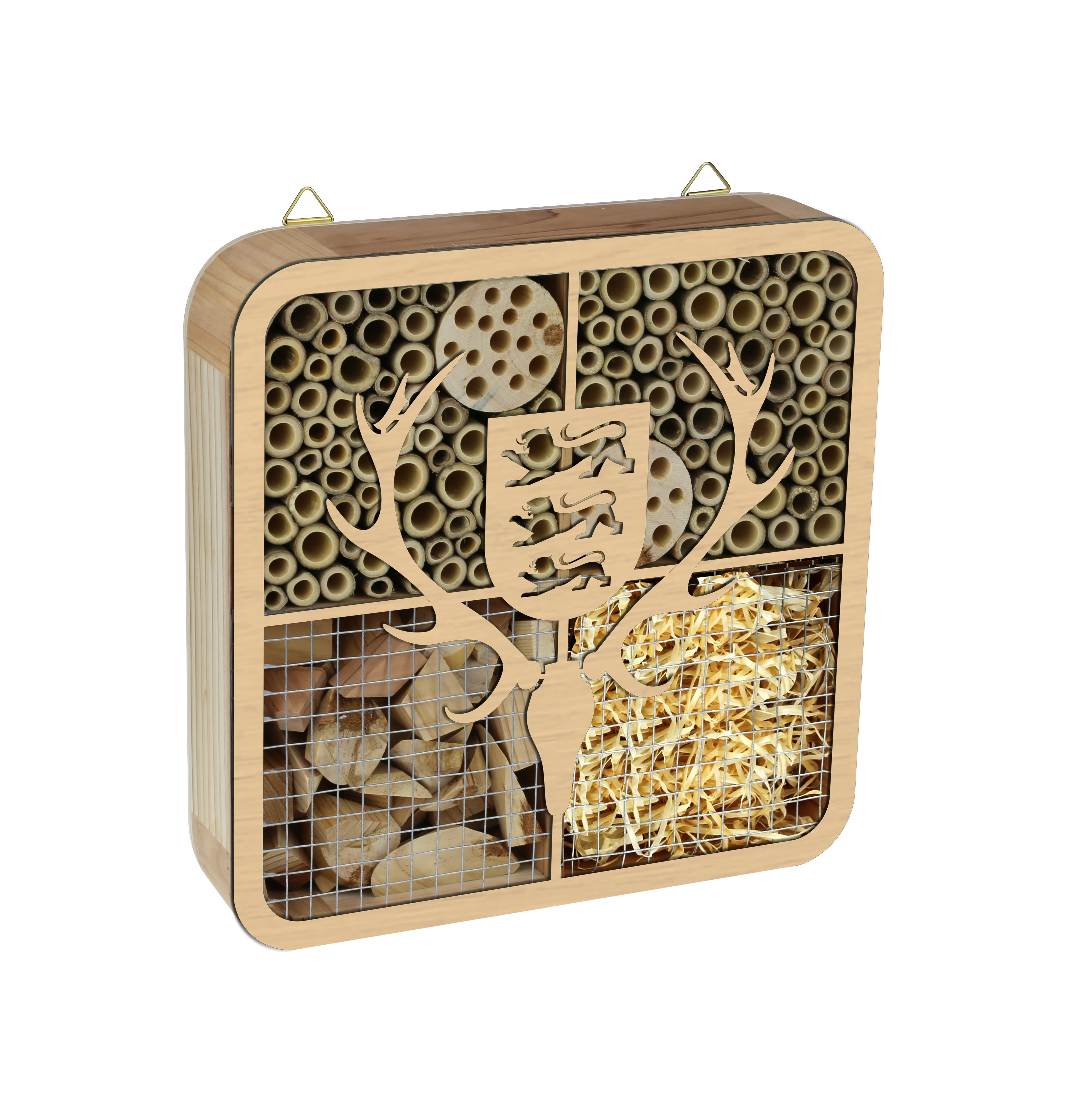 Das LJV Insektenhotel aus zertifizierten Hölzern bietet vielen unterschiedlichen Insekten in den verschiedenen Segmente eine wertvolle Nisthilfe,